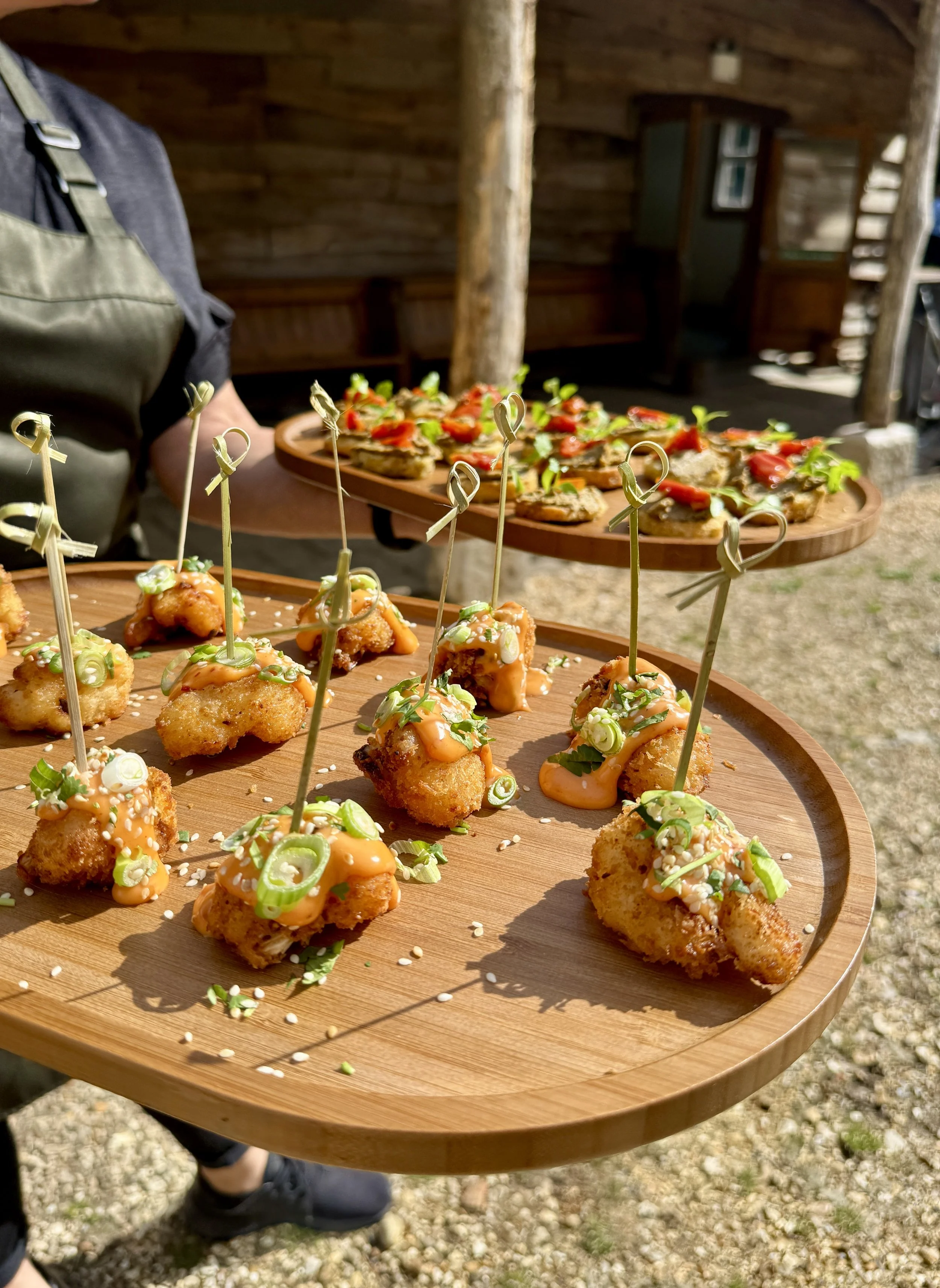 - Cheese & Bac’n - V\VG | GFBang Bang Cauliflower Skewers topped with finely chopped Coriander, Spring Onions & Sesame Seeds - V/VG